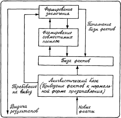 На рис. 18 показана общая структура системы, позволяющей получать силлогистические выводы. Четыре блока системы выполняют следующие функции. Новые факты, поступающие в систему, попадают в лингвистический блок, который преобразует их в нормальную форму. Если вспомнить первоначальную форму посылок в сорите о ростовщиках и любителях выпить, то становится понятным, что работа лингвистического блока не столь проста. В его задачу входит не только «навешивание»