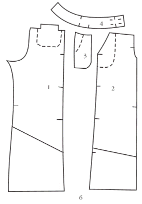 1 — задняя половина; 2 — передняя половина; 3 — боковая часть передней половины с цельнокроеной мешковиной кармана; 4 — пояс.