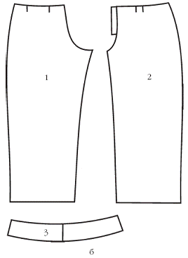 Рис. 15. Брюки (модель 15): а — внешний вид; б — детали кроя: