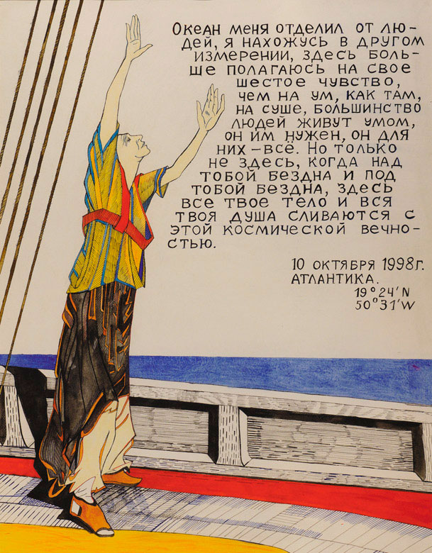 09:45. Ветер восточный, большая зыбь. Иду курсом 170°–180°. Сегодня по телефону говорил с корреспондентом «Московской правды». И, как обычно, я слышу от всех представителей прессы: зачем ты пошел в море, кому это надо? Мой ответ такой: