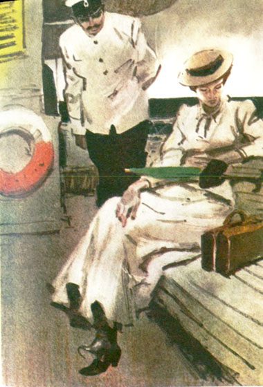 Елена опять вышла на палубу. Сильный ветер, дувший навстречу пароходу, облеплял вокруг ее ног платье и заставлял ее нагибаться вперед и придерживать рукой край шляпы.