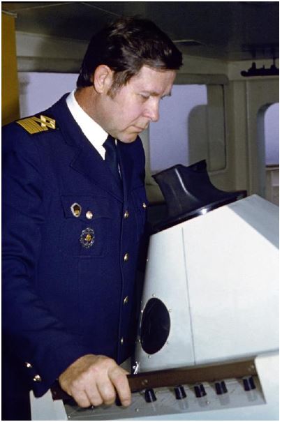 Капитан дальнего плавания Георгий Фёдорович Григорьев на мостике флагмана космического флота у монитора радиолокатора.