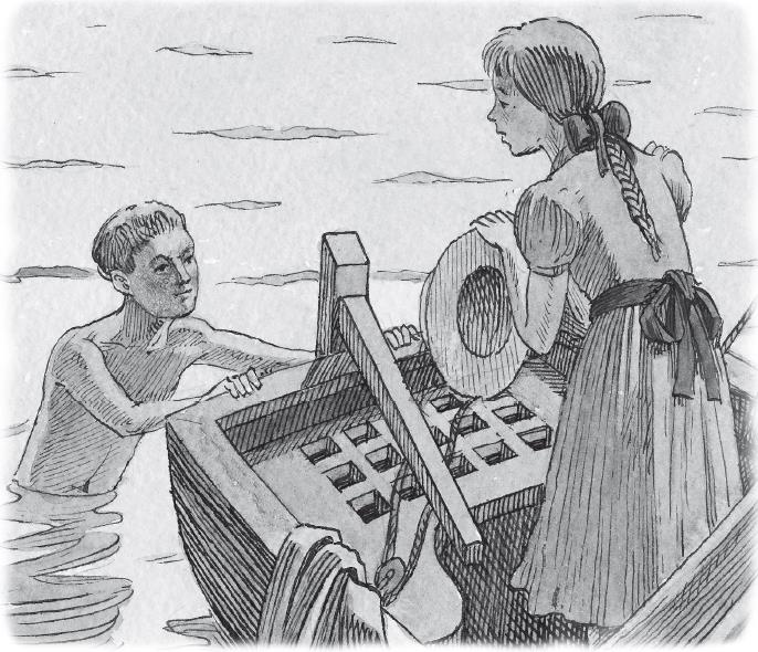 Вдруг шлюпка споткнулась, стала и наклонилась набок. Я скорей опустил парус, чтобы совсем не опрокинуться. Нина вскочила. Спросонья она не знала, где она, и глядела, вытаращив глаза.