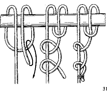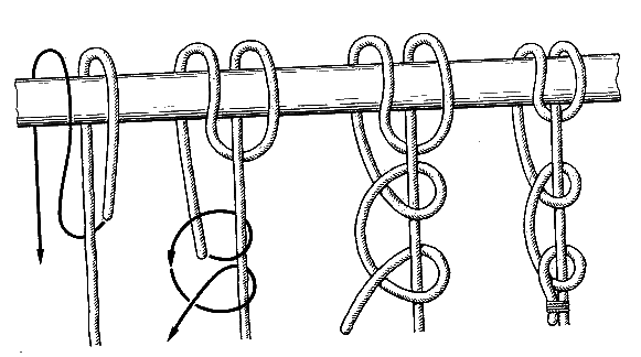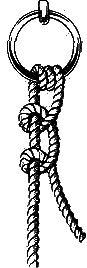 Мачтовый штык(рис. 17). Здесь оригинальная комбинация двух хороших узлов дает надежный и простой узел. Сначала вокруг предмета, к которому крепят трос, завязывают выбленочный узел (см. рис. 48) и на коренном конце троса делают обычный штык, который,как известно, тоже представляет собой видоизмененный выбленочный узел. Чтобы мачтовый штык не получился затягивающимся, первый узел до конца не затягивают.