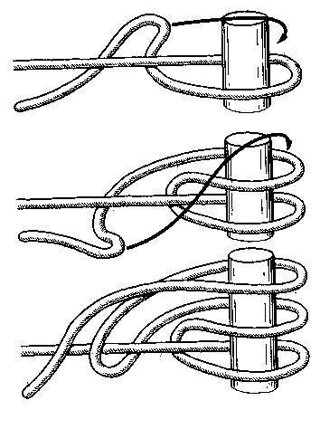 Рыбацкий штык (или якорный узел) в какой-то степени схож с простым штыком со шлагом (см. рис. 12). Отличается от него тем, что первый из двух полуштыков проходит дополнительно внутри шлага, обхватывающего предмет. Применяя этот узел для якоря, всегда необходимо прихватывать ходовой конец схваткой к коренному. В этом случае, даже при очень сильной тяге, рыбацкий штык не затягивается и надежно держит. Его можно смело применять во всех случаях при работе с тросами, когда они подвержены сильной тяге.