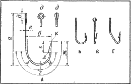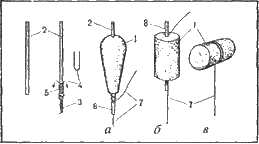 а — легкосъемный со штырьком; 1 — корпус, 2 — бамбуковая палочка, 3 — штырек из латунной проволоки, 4 — проволочная петля, 5 — обмотка из ниток, 6 — хлорвиниловая трубка, 7 — леска, 8 — деревянная шпилька