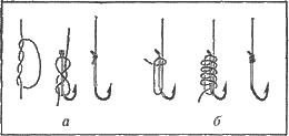 Рис. 4. Способы привязывания крючков к леске: а — «восьмеркой», б — обмоткой
