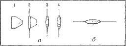 а — веретенообразное из свинцовой пластинки; 1 — подготовленная пластинка, 2 — зажим лески, 3 — закрутка, 4 — готовое грузило; б — скользящее грузило «оливка»