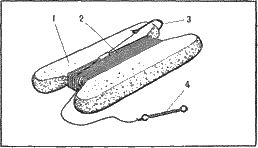 1 — пенопластовый корпус, 2 — леска, 3 — крючок, 4 — проволочная закрутка для протягивания и закрепления лески