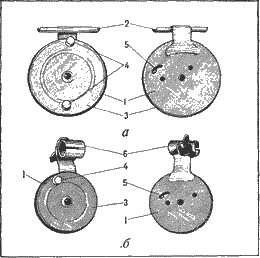 Если же глубина воды нарастает постепенно и требуется забрасывать насадку на большее расстояние, чем это можно сделать удочкой глухой оснастки, применяют бегучую снасть. Для нее нужно удилище с пропускными кольцами и катушкодержателем, на котором устанавливается небольшая, так называемая проводочная катушка с запасом длинной безузловой лески с крючком, грузилом и хлорвиниловой трубочкой для крепления поплавка. Из имеющихся в продаже проволочных катушек для морской ловли более всего подходят модели КПП-65 и КПП-50 («Краб») с пластмассовыми барабанами, имеющими стопор обратного хода (рис. 8). Катушка «Краб» снабжена приспособлением для крепления к удилищу.