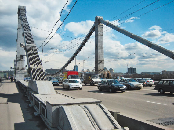 Единственный висячий мост Москвы проходит через реку по трассе Садового кольца и соединяет Крымскую площадь с улицей Крымский Вал, выходящей на Калужскую площадь. Современное сооружение было построено в 1938 г. А раньше на этом месте находились: вначале – Никольский деревянный мост, построенный в 1789 г. по проекту А. Герарда, веком же позже – металлический мост (автор проекта В. Шпейер).