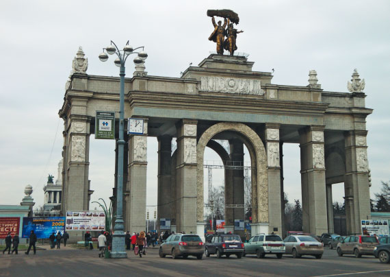Архитекторами Всесоюзной сельскохозяйственной выставки выступили В. Щуко, В. Гейльфрейх, Л. Поляков, Д. Чечулин, над украшением павильонов работали скульпторы С. Коненков и Г. Мотовилов; монументалисты А. Дейнека и А. Бубнов, П. Соколов-Скаль и другие известные художники того времени. Например, арка на входе, похожая на традиционные древнеримские триумфальные арки, была построена по проекту архитектора Л. Полякова. Помимо этого при въезде на выставку стояла 24-метровая скульптурная группа «Рабочий и колхозница» (В. Мухиной), получившая признание на международной выставке в Европе.