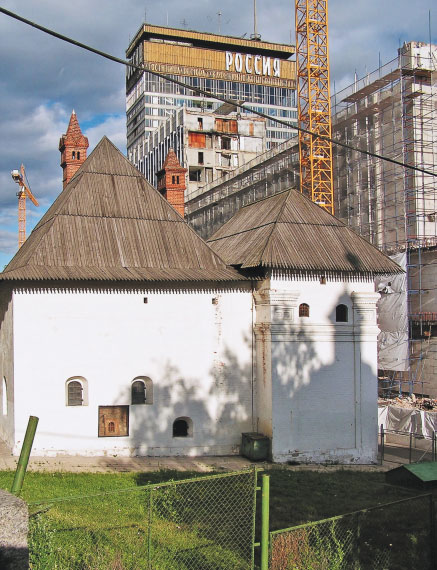 Территория, находящаяся позади церквей Варварки, – это огромный строительный участок. С середины XX века и до 2000-х здесь находился известный на всю Европу гостиничный комплекс «Россия». О его достоинствах и недостатках спорили с момента постройки. Но про комплекс можно сказать точно одно: он «убивал» своим видом плывущий над Красной площадью храм Василия Блаженного. И закрывал панораму Кремля.