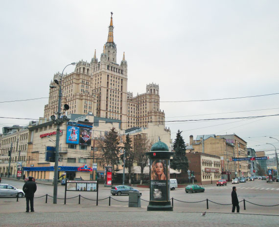 Про сталинскую высотку отметим лишь, что она входит в знаменитую семерку советских зданий. Центральную восьмигранную башню в форме шатра венчает шпиль. В боковых корпусах расположились магазины, ночные клубы и рестораны. (Более подробно о высотках Москвы см. фильм «Жестокость».)