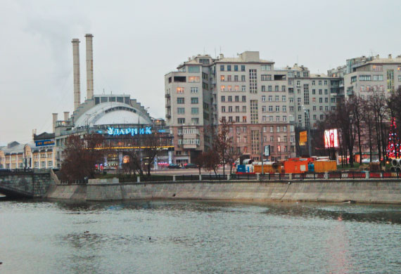 В следующий раз влюбленную пару мы видели снова на набережной. Это хорошо известный многим вид «стрелки» – места, где встречаются Водоотводный канал и Москва—река. Там находятся кинотеатр «Ударник» и шоколадная фабрика «Красный Октябрь». Между прочим, во времена, показанные в фильме, запах шоколада был «слышен» по всей Полянке и во двориках Кадашей.