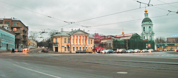 Вы подошли к перекрестку. Здесь заканчивается Бульварное кольцо, то есть – бывшая когда-то стена Белого города с Яузскими воротами. В 1970-х годах площадь была реконструирована, до наших дней почти целиком сохранилась только левая часть застройки XVIII – начала XIX века. Вид на это место с высотки и Устьинского моста просто замечательный: особняк XVIII века и стоящая на холме барочная церковь Петра и Павла (1700–1702 гг.), а также угловой дом № 1 (1824 г., арх. Д. Жилярди), ряд торговых лавок начала XIX века; расположенная рядом церковь Троицы (XVII–XVIII века) и жилой дом начала XIX века.