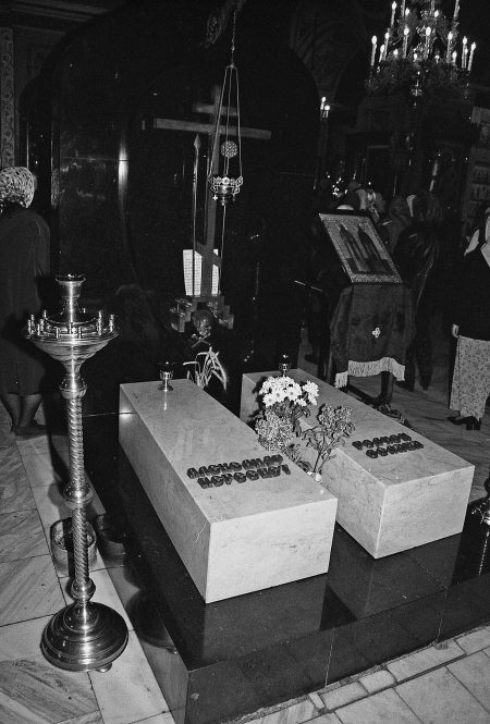 Рис. 2.14. Современные надгробия Пересвета и Осляби в церкви Рождества Богородицы в Старо-Симоновом монастыре в Москве. Установлены после 1985 года. К 2008 году они были уже вынесены из церкви во двор, а имена Пересвета и Осляби с них сбиты. Фотография 2000 года.