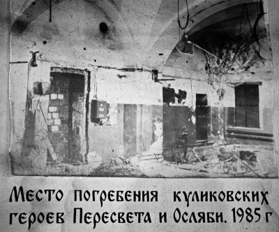 Подлинная древняя каменная «доска», возложенная на могилу Осляби и Пересвета в XIV веке, и о которой упоминает, например, Н. М. Карамзин [75], т. 5, гл. 1, примечание 82, сегодня вообще не видна. Под новым надгробием ее нет, как нам сказали в самой церкви. Возможно, она до сих пор заделана в стену церкви, как о том пишет Н. М. Карамзин. Но об этом в церкви сегодня никто ничего не знает. Скорее всего, она была варварски раздроблена отбойными молотками среди множества других древних плит с надписями, которые на одном из субботников в 1960-х годах были вынесены из церкви и здесь же уничтожены! Об этом нам сообщил (в Старом Симонове, в 1994 году) очевидец этих событий, принимавший участие в этих субботниках по уничтожению реликвий. Он лично выносил плиты из церкви. Во всяком случае, где сегодня находится древняя надгробная плита, и что на ней было написано, нам выяснить не удалось.
