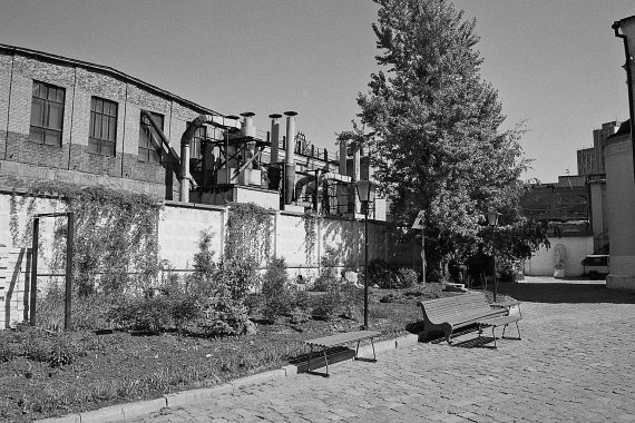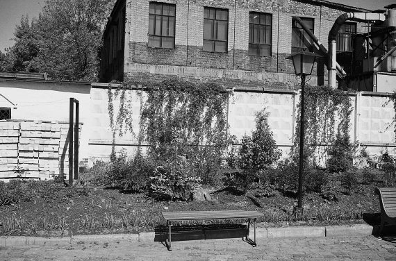 Рис. 2.16. Стена за алтарем церкви Рождества Богородицы. Дальше – заводские постройки. Вдоль стены недавно перезахоронены останки, выкопанные на дворе церкви при проведении хозяйственных работ. Над некоторыми захоронениями стоят кресты. Место захоронения, которое мы видели в 1994 году, отмечено валуном под маленькой елочкой на переднем плане. Фотография 2000 года.