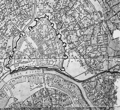 Московское Куликово поле не было застроено и в прошлом. Достаточно взглянуть на карты и планы Москвы XVIII века. См. например рис. 3.2, взятый нами из [112]. На старом плане хорошо видно, что в XVIII веке на месте московских Кулишек ПОСТРОЕК НЕ БЫЛО. Уникальную фотографию редкого плана Москвы примерно 1670 года любезно предоставил в наше распоряжение профессор географического факультета МГУ B. C. Кусов. На плане показано устье реки Яузы и отчетливо видно, что правый берег Яузы не застроен – здесь находились ОГОРОДЫ.