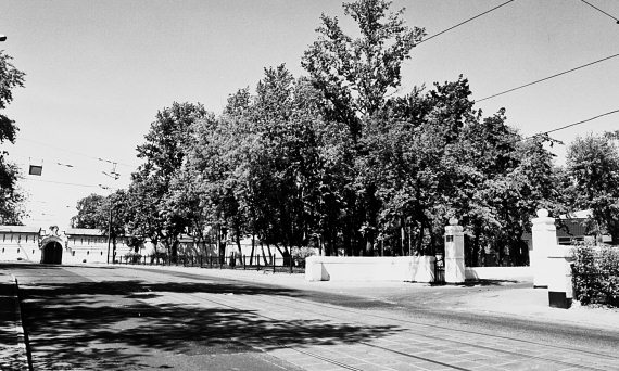 Сегодня старый некрополь Андроникова монастыря фактически уничтожен. Как нам сообщили в музее Андроникова монастыря в мае 2000 года, огромный некрополь монастыря в 1924 году сровняли с землей, СГРЕБЛИ БУЛЬДОЗЕРАМИ. Сегодня большая часть территории этого бывшего некрополя находится за пределами монастырских стен, поскольку одна из стен монастыря была в XX веке передвинута. В результате размеры монастыря существенно уменьшились и некрополь оказался за его стенами. Современный общий вид некрополя показан на рис. 3.6. Сегодня на месте некрополя находится сквер и проложена дорога с трамвайными путями. Монастырская стена, видная на рис. 3.6, построена уже в XX веке вместо прежней стены, охватывавшей когда-то весь старый некрополь. Недавно здесь поставили несколько деревянных крестов, чтобы отметить место старинного захоронения, рис. 3.7. Как нам сообщили в Спасском соборе монастыря, эти кресты установлены именно в память героев Куликовской битвы, захороненных на этом кладбище в XIV веке. В будущем здесь намереваются возвести часовню.