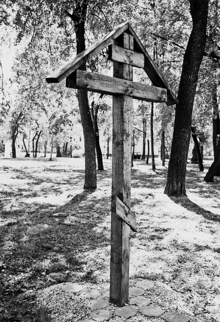 Рис. 3.7. Деревянный крест, установленный недавно в память о воинах, павших в Куликовской битве и захороненных на старом кладбище Спасо-Андроникова монастыря. Об этом нам рассказали сотрудники музея, расположенного в монастыре. Фотография 2000 года.