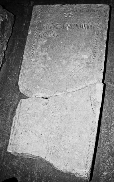 Рис. 3.9. Вторая надгробная плита XVI века из некрополя Спасо-Андроникова монастыря, выставленная сегодня в его музее. Здесь также изображен старинный вилообразный крест. В верхней части была какая то надпись, но она грубо сбита. От нее остались лишь небольшие фрагменты, не содержащие ни одного целого слова. Фотография 2000 года.