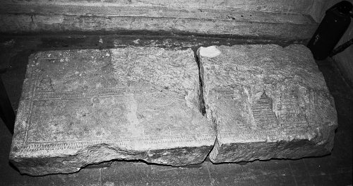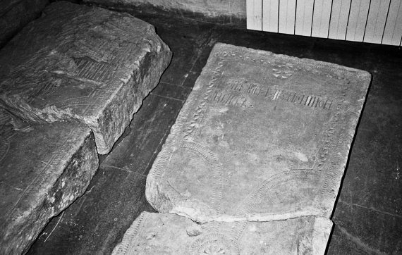 Рис. 3.10. Верхние части надгробных плит XVI века с надписями из музея Спасо-Андроникова монастыря. Фотография 2000 года.