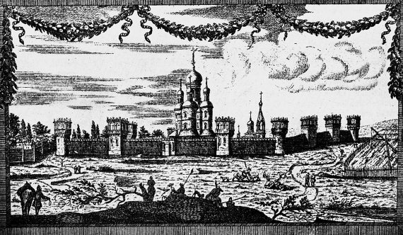 Рис. 3.11. Старинное изображение Донского монастыря в Москве начала XVIII века. Клеймо гравюры Петра Пикара. Взято из [24], с. 7.
