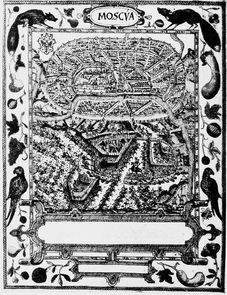 Рис. 3.15. План Москвы из книги Исаака Массы «Album Amicorum». Рукопись якобы 1618 года. Считается иллюстрацией «к повествованию о разгроме войск Казы Гирея под Москвою в июле 1591 г. … Воспроизведен лист, рассказывающий о начале военных действий… Изображению Москвы отведена его верхняя часть» [115], с. 19. Обращает на себя внимание пустой картуш на карте, в котором, скорее всего, была какая то надпись. Взято из [115], с. 19.
