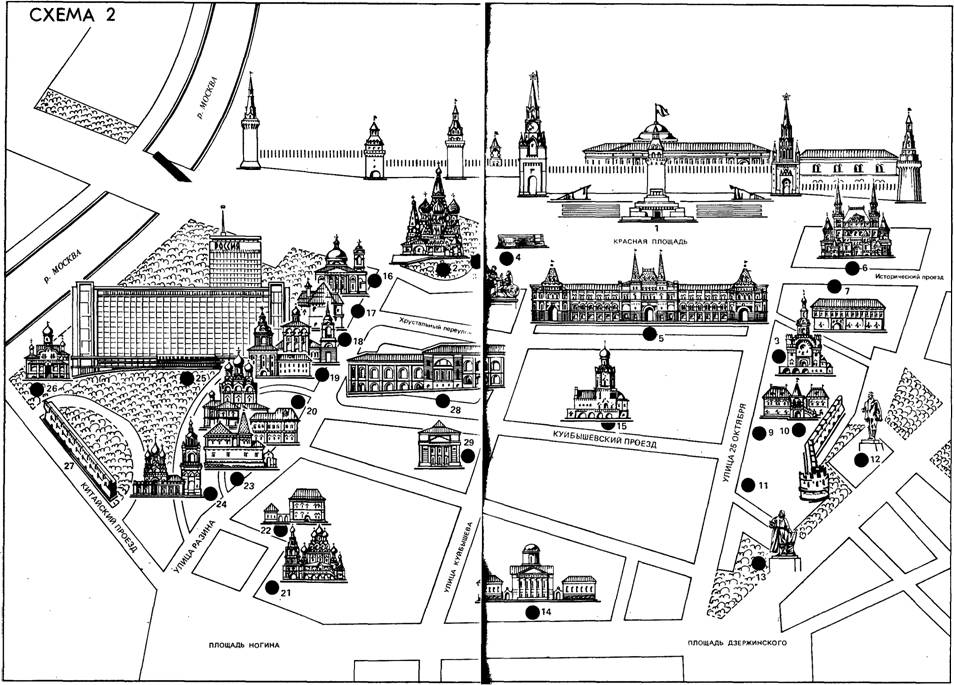 1 — Мавзолей В. И. Ленина; 2 — собор Василия Блаженного; 3 — памятник Минину и Пожарскому; 4 — Лобное место; 5 — б. Верхние торговые ряды (ныне ГУМ); 6 — Исторический музей; 7 — б. Монетный двор; 8 — б. Заиконоспасский монастырь; 9 — Историко-архивный институт; 10 — б. Правильная палата Государева печатного двора; 11 — ресторан «Славянский базар»; 12 — памятник Я. Свердлову; 13 — памятник первопечатнику Ивану Фёдорову; 14 — Музей истории Москвы; 15 — собор б. Богоявленского монастыря; 16 — церковь Варвары; 17 — Старое Английское подворье; 18 — церковь Максима; 19 и 20 — б. Знаменский монастырь (кельи, колокольня и собор); 21 — церковь Троицы «в Никитниках»; 22 — жилые палаты XVII в.; 23 — б. Государев двор; 24 — церковь Георгия «на Псковской горке»; 25 — гостиница «Россия»; 26 — церковь Зачатия Анны «что в углу»; 27 — фрагмент стены Китай-города; 28 — Старый Гостиный двор; 29 — б. Биржа (ныне Торгово- промышленная палата СССР).