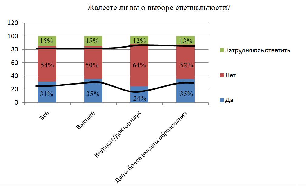 Тех, кто жалеет о выборе специальности, меньше среди респондентов с кандидатской и докторской степенью. Отчасти это объясняется тем, что интерес к выбранной ими в молодости специальности был настолько велик, что они продолжают развиваться в выбранном направлении. Но и среди этой группы респондентов почти четверть (24%) сожалеют о выборе профессии.
