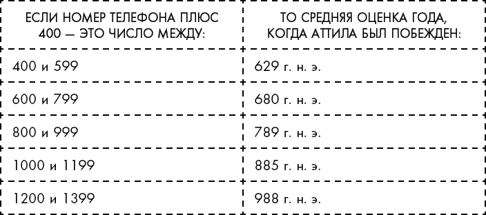 Вы можете проверить собственную склонность к якорению с помощью следующего простого упражнения. Возьмите последние три цифры вашего телефонного номера, затем добавьте 400 (например, если ваш номер заканчивается цифрами 237, добавление к нему 400 дает 637). Теперь ответьте на следующие два вопроса: был ли вождь гуннов Аттила побежден в Европе до или после этого года? И в каком именно году был побежден вождь гуннов Аттила?