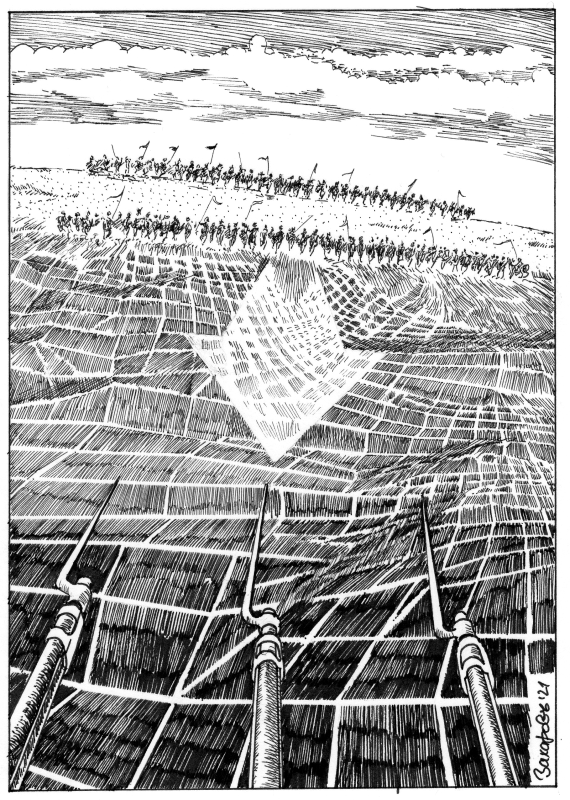 Передовые эскадроны достигли гребня шеренгами по восемь человек, двигаясь быстрой рысью, покрывая чуть более двухсот ярдов в минуту, и две передние шеренги быстро ускорились. К тому времени, как они преодолели ещё сорок ярдов, они двигались полным карьером, комья влажной земли сыпались из под копыт, копья и сабли сверкали на солнце, в то время как следующие две шеренги грохотали в тридцати ярдах позади них. Вокруг и позади них раздавалась музыка горнов, барабанящий грохот шестнадцати тысяч копыт и низкий лающий крик, когда они наконец повернулись к своим врагам.