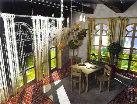 Создание всего лишь одной комнаты, такой, например, как на рисунке, — с окнами, шторами, мебелью, люстрой и кафельным полом, — дело кропотливое.