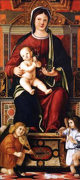 Синее платье Богоматери заткано богатым золотым узором геральдического характера, который говорит о принадлежности одеяния персоне высокого ранга. Красная ткань, покрывающая сиденье Мадонны и балюстраду заднего плана, украшена изображениями плодов граната, символа воскрешения. Однако не следует забывать и то, что именно гранатом Ева соблазнила Адама, поэтому искупительная жертва Христа за грехопадение также просматривалась в содержании образа. Иконография, предложенная художником, совершенно необычна: Младенец Иисус предлагает игольницу Богоматери, занятой вышиванием. По бокам от центральной группы — святая Екатерина Александрийская и святой в короне мученика.