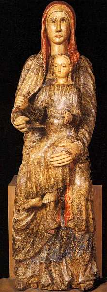 Архаическая форма, в которой исполнена эта деревянная скульптура, красноречиво отсылает зрителя к истокам иконографии Марии с Младенцем, а именно изображениям древнеегипетской богини Исиды с младенцем Гором, пришедшим в западное искусство через Византию. Деревянные статуэтки святых были распространенным явлением в Средние века. В западноевропейском искусстве XII–XIII столетия называют «эпохой Мадонны».