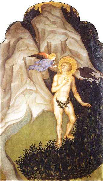 Венецианец Николо ди Пьетро, ученик Джентиле да Фибиано, использовал популярнейшую иконографию изображения святого Бенедикта (480–543), католического святого, основателя монашеского ордена, названого его именем (бенедиктинцев). На представленной работе ангел, появляющийся в пустыне среди скал Субиако, предупреждает Бенедикта об опасности, которую создает дьявол в виде ворона, искушающий отшельника эротическими видениями. Чтобы избавиться от мучительных картин, святой обнаженным истязал себя колючим шиповником и крапивой. Тело отшельника, кусты и все вокруг него изображено с возможным натурализмом, однако фигурка ангела, расцвеченная ярче, чем остальные фрагменты картины, выдержана в условном готическом стиле.