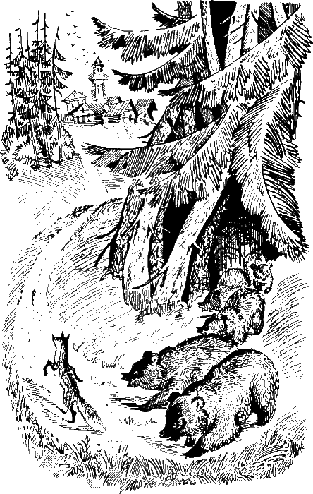Медведь побежал в дуброву, собрал сорок чёрных медведей, привёл их к лисе, и лисица привела их к царю. Сама забежала вперёд и говорит: