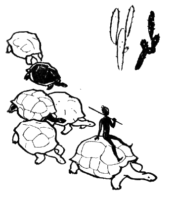 В этой долине он увидел черепах. Они шли громадным стадом, тяжело передвигаясь на своих толстых ногах и вытянув вперед головы на длинных черных шеях. Вероятно, животные шли так уже несколько дней.