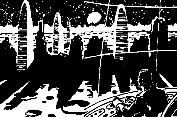 Эдвардс возвращается на Луну, но не к себе, в башню, а на равнину «Моря Дождей». Здесь расположен главный лунный космодром. Могучие тела, более грузные, чем у ракет, стартующих с Земли, заполняют его. В безвоздушном пространстве резче, чем на Земле, обрисовываются контуры кораблей. Сверкающие гроздья, готовые в любой момент ринуться в пространство.