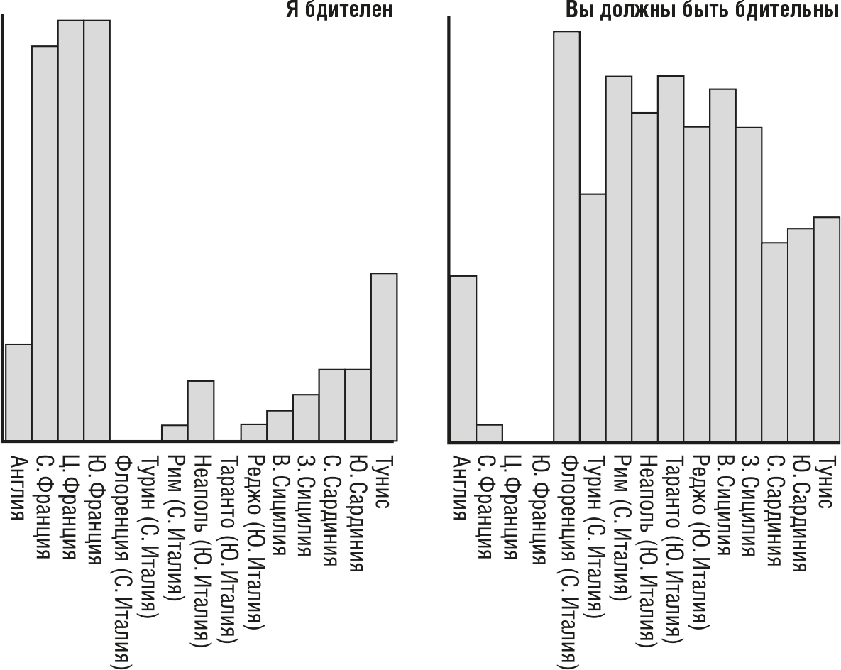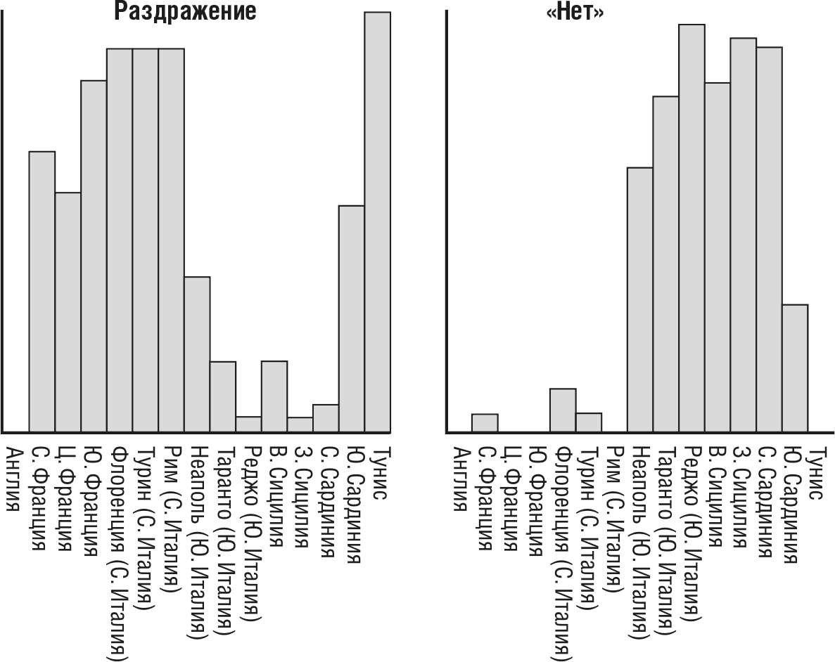 Знак «пальцы из-под подбородка» (см. рис. 2 на следующей странице) в Англии неизвестен; во Франции и на севере Италии он означает «исчезни»; в Южной Италии этот знак не является оскорбительным и означает «ничего особенного». Эта разница отражена в распределении значений знака на графиках.