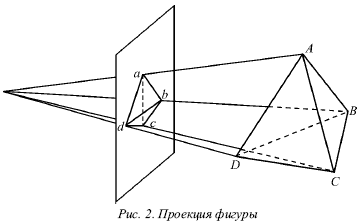 Для построения центральной проекции объекта нужно между глазом и изучаемым предметом поместить прозрачный экран и отметить на нем точки пересечения лучей, которые идут от глаза человека к отдельным точкам предмета. При соединении всех точек на экране получаем изображение (проекцию) фигуры (рис. 2). Эта проекция называется центральной.