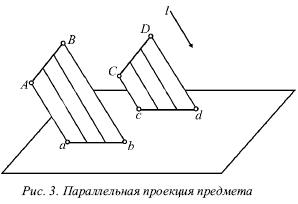 При построении параллельных проекций нужно задать направление проецирующих лучей (рис. 3). На данном примере в качестве направляющего луча выбран луч l. При построении изображений через все точки проводятся прямые, параллельные установленному направлению проецирования, до точки пересечения с плоскостью проекции. Соединяя полученные точки, получаем параллельную проекцию предмета.