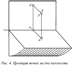 проекции точек на две плоскости, для чего возьмем две перпендикулярные плоскости (рис. 4), которые будем называть горизонтальной фронтальной и плоскостями. Линию пересечения данных плоскостей называют осью проекций. На рассмотренные плоскости спроецируем одну точку А с помощью плоской проекции. Для этого необходимо опустить из данной точки перпендикуляры Аа и A на рассмотренные плоскости.Проекцию на горизонтальную плоскость называют горизонтальной проекцией точки А, а проекцию а на фронтальную плоскость называют фронтальной проекцией.