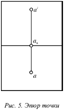 При повороте горизонтальной плоскости на 90° можно получить чертеж, в котором обе плоскости находятся в одной плоскости (рис. 5). Данная картина называется эпюром точки.