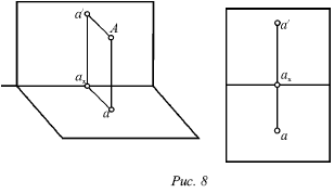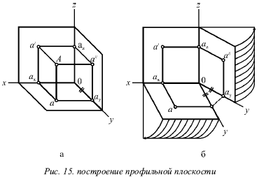 На рисунке 15а показана точка А и три ее проекции. Проекцию на профильную плоскость (а) называют профильной проекцией и обозначают а.