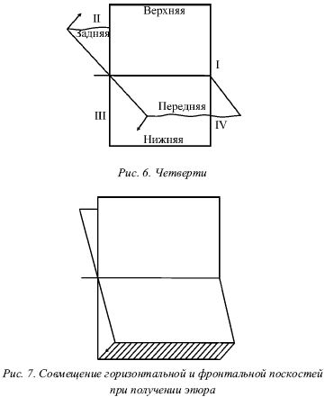 Ось пересечения плоскостей делит горизонтальную плоскость на две четверти – переднюю и заднюю, а фронтальную плоскость – на верхнюю и нижнюю четверти. Верхнюю часть фронтальной плоскости и переднюю часть горизонтальной плоскости рассматривают как границы первой четверти.