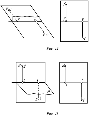 В случае, когда точка К лежит на фронтальной плоскости (рис. 13), ее горизонтальная проекция k лежит на оси пересечения плоскостей, а фронтальная k показывает фактическое местонахождение этой точки.