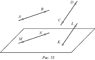 Рассмотрим признак параллельности прямой и плоскости. Прямая является параллельной плоскости, когда она параллельна любой прямой, лежащей в этой плоскости. На рисунке 53 прямая АВ параллельна плоскости Р, так как она параллельна прямой MN, которая лежит в этой плоскости.
